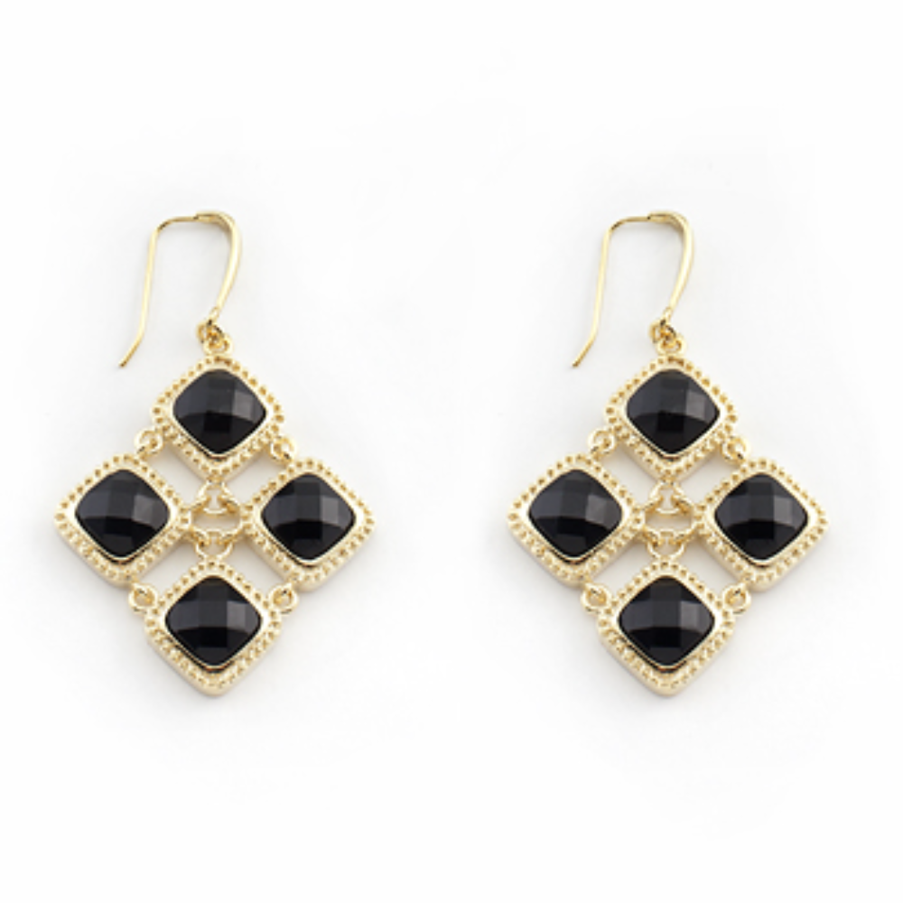 Make a bold, chic statement with these gold-tone dangle earrings, featuring sleek black cushion-cut stones arranged in a modern geometric design. Perfect for elevating any outfit with effortless sophistication.